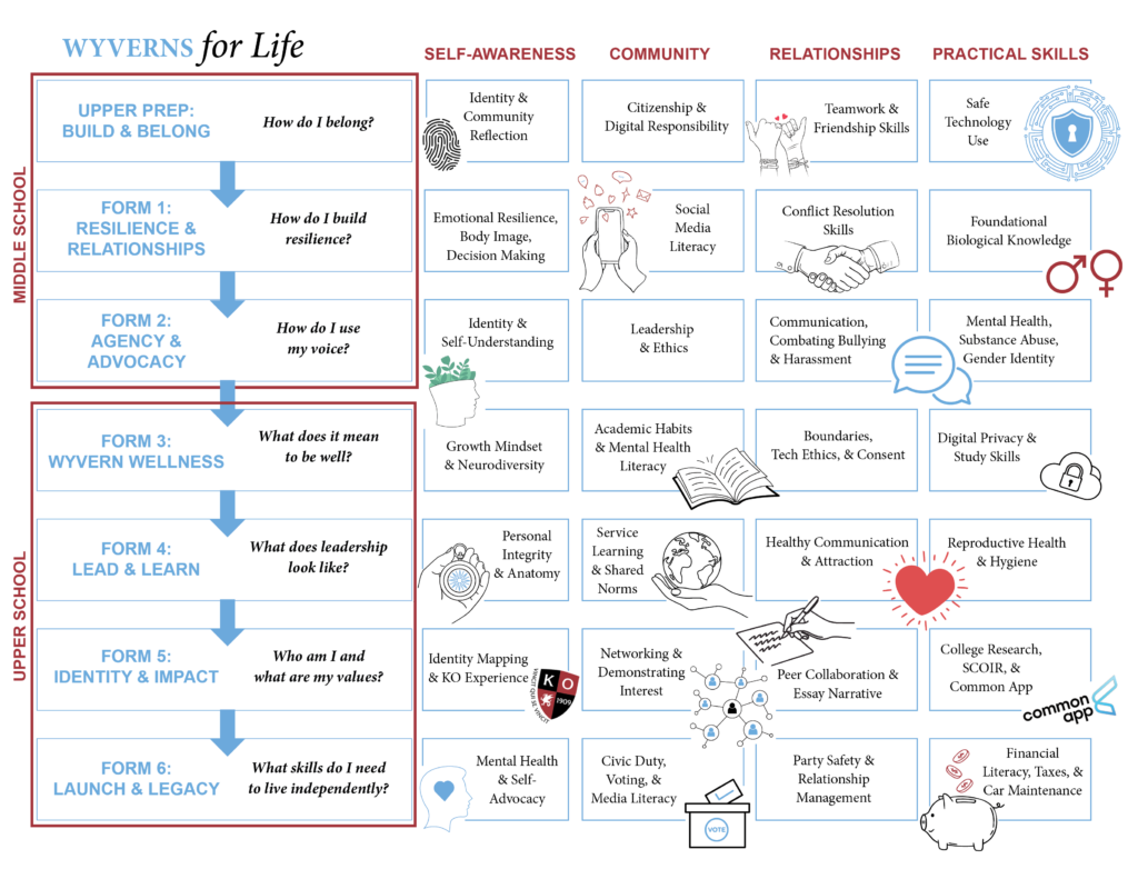 Wyverns for Life is not a single program—it’s a developmental journey. Our Wyverns for Life curriculum guides students from Upper Prep through Form 6, helping them develop the skills to build healthy identities, strong relationships, and a sense of confident independence. Students explore: emotional intelligence, mental health and resilience, healthy relationships, digital citizenship, leadership, and service & life readiness skills