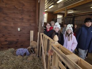 Inside the tidy, warm barn, the Farm 101 group met two goats, one of which was recovering from a recent medical procedure. Wrapped in blankets and nestled into straw bedding, the goats rested comfortably alongside an unexpected companion: a giant teddy bear. Students learned the touching story behind it. Blossom, a sweet donkey who was orphaned at just four months old, found comfort snuggling with a stuffed bear. It soothed her so completely that the sanctuary added more teddy bears—now a cuddly staple in many of the pens.Â